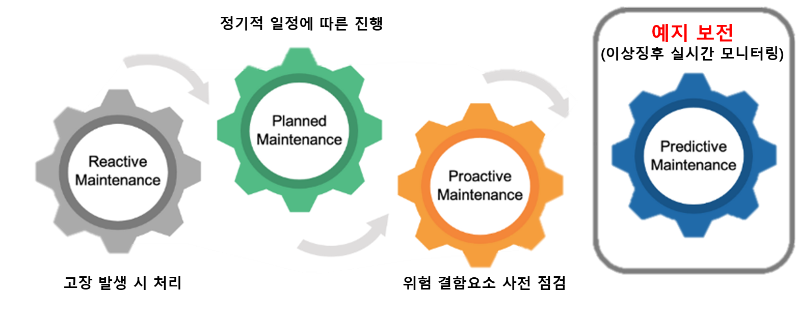 Predictive maintenance is a technology that inspects and monitors equipment to detect and predict abnormalities. It has evolved through four stages of technological development: ① Reactive maintenance – addressing issues only after failure occurs. This approach causes productivity loss since equipment stops running until repairs are completed. ② Planned maintenance – performing maintenance according to pre-set schedules. Technicians carry out maintenance based on each machine’s failure history and inspection cycle. However, this can waste resources because even fully functional machines undergo maintenance. ③ Proactive maintenance – identifying and removing potential defect factors in advance to improve equipment performance. While this minimizes downtime, it still results in resource inefficiency similar to planned maintenance. ④ Predictive maintenance – utilizing AI and big data to detect abnormal data and respond to failures in real time. This approach minimizes resource waste and maintains productivity through timely intervention. In this case, sensors for anomaly detection and data analysis for future anomaly prediction are essential. To achieve accurate diagnostics, research combining AI and big data is actively underway.